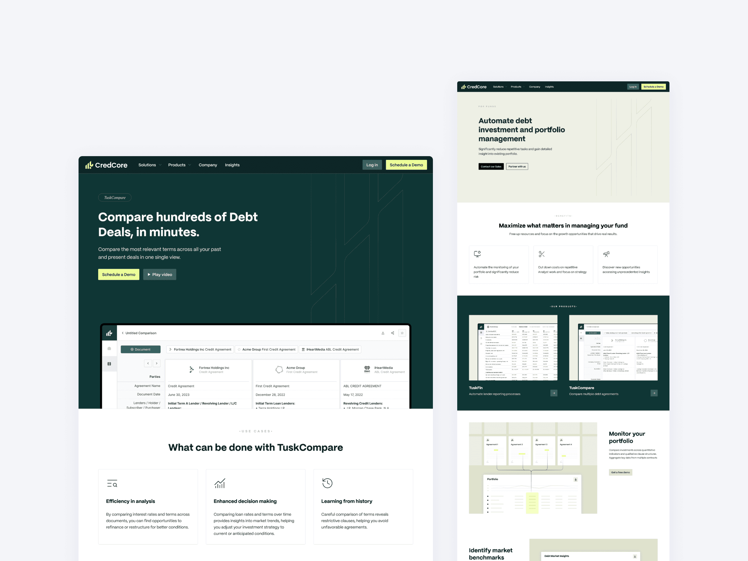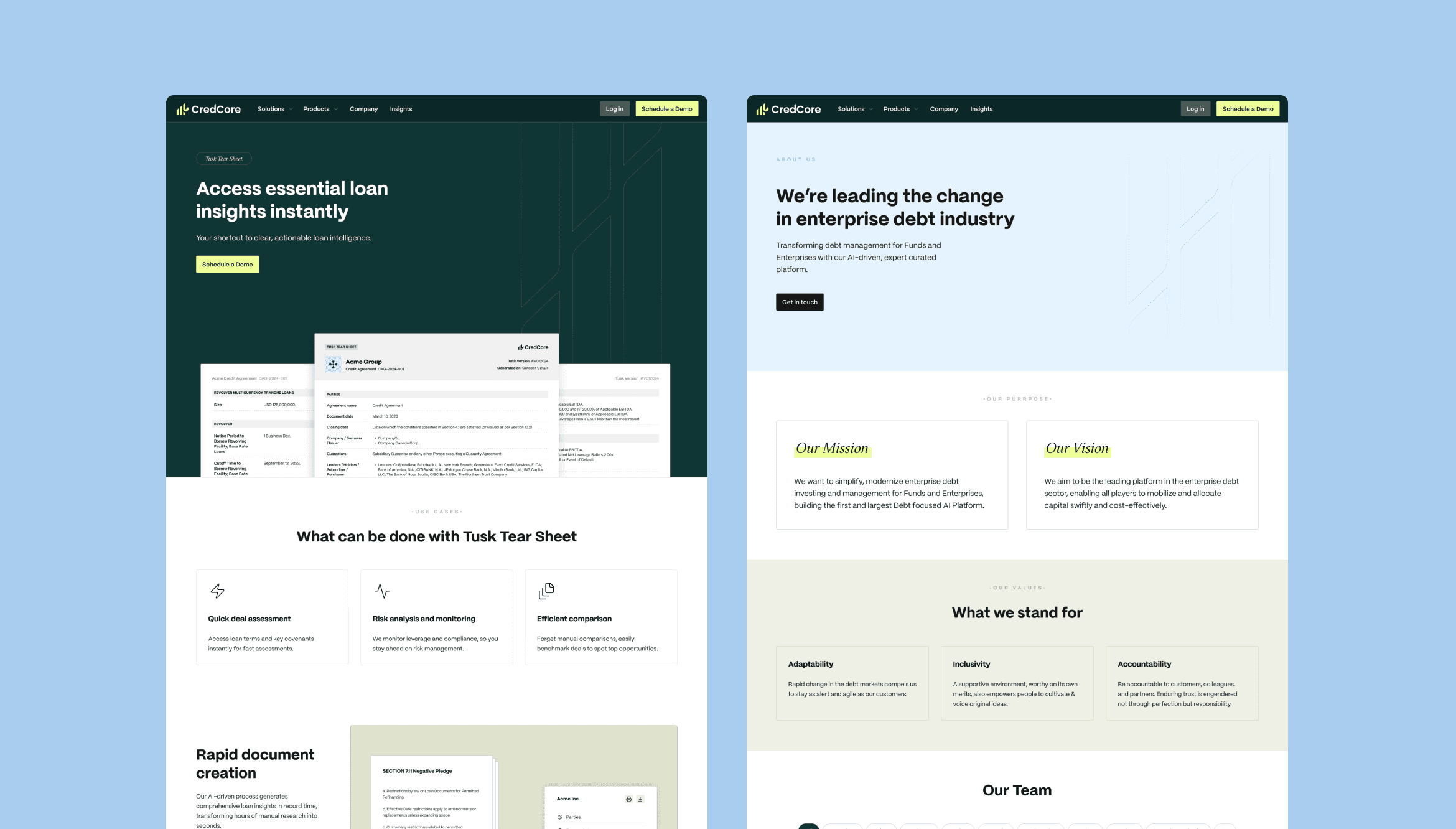 The redesign made navigation more intuitive, helping users quickly access key information. Messaging was sharpened to clearly communicate CredCore’s offerings and build trust. Visually, the updated tone and layout better reflect the company’s positioning in the market. The new design system established a solid foundation for consistency and future scalability.